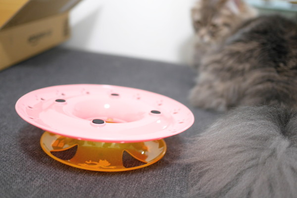 ねこのきもちのオモチャの上にiPadを乗せたら、良い感じでにボールが見えなくなったらしく、