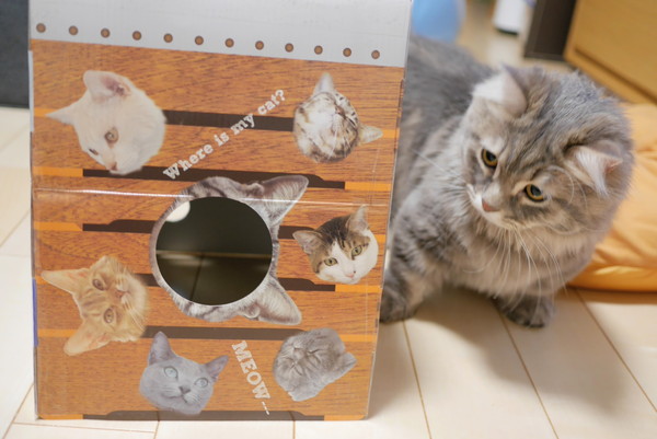 (;´Д`)< あ。頭を突っ込む方向そっちからじゃないのよ。箱を倒して内側からお願い