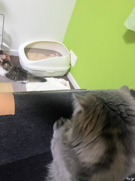 トイレの段ボールは、子猫さんがソファーの生地に爪を引っかけて登って脱走しちゃうので、その対応策です。