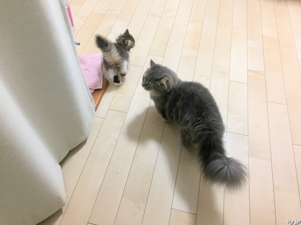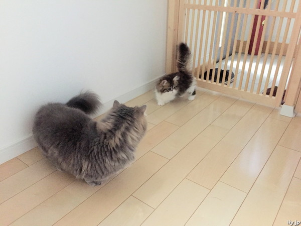 隔離されていた子猫部屋を脱走できたポテトさんは、さらに家の中探索に出発です