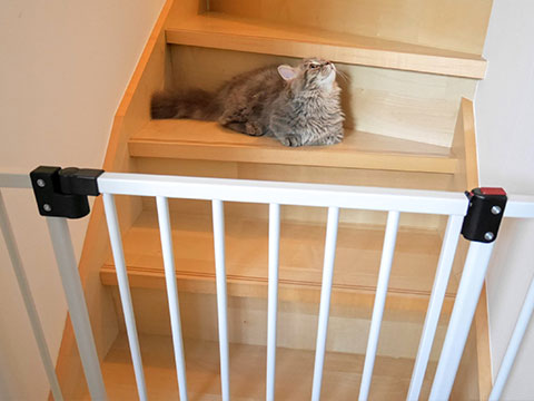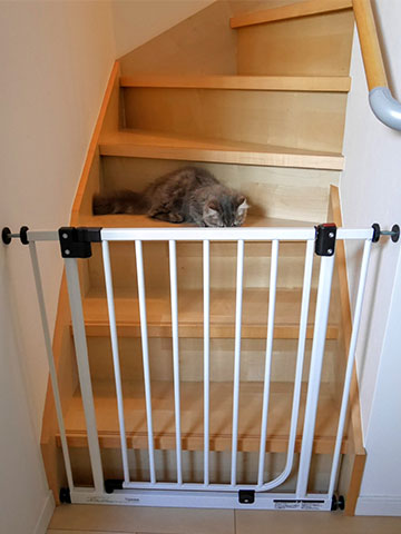 組立て終わって、さっそくベビーズゲートを階段の最上段につけようとしたら…、