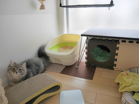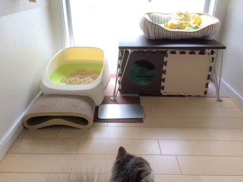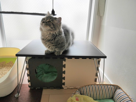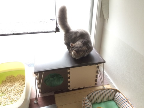 猫箱を平屋に改修しても安定性に不安があるので、テーブルをかぶせておきました( ̄д ̄)