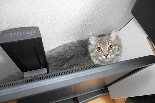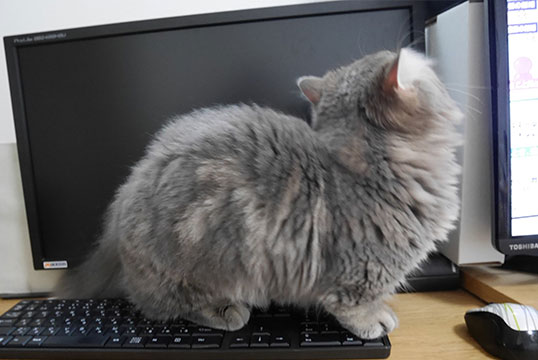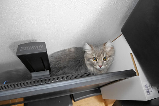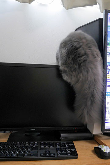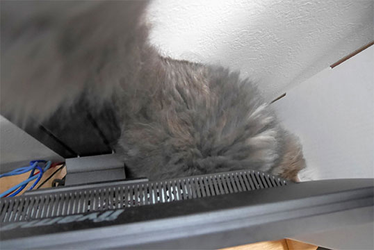 PCのキーボードから降りないあげく、テレビの後ろに潜り込もうとしているもよう