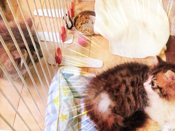 匂いの元がどうしても気になるタルトさん。 子猫のいる方にジリジリと近づいていきましたん(;・∀・) せっかくなので、柵越しにちょっとだけ二匹をご対面させてみました 「!?!?!?」